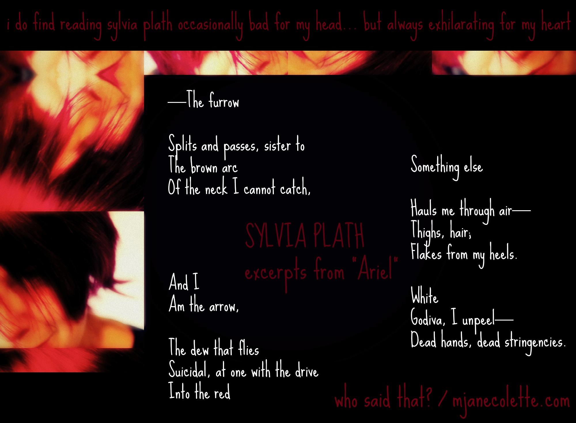 I’m sunk in Sylvia Plath right now. It’s dangerous. Look: