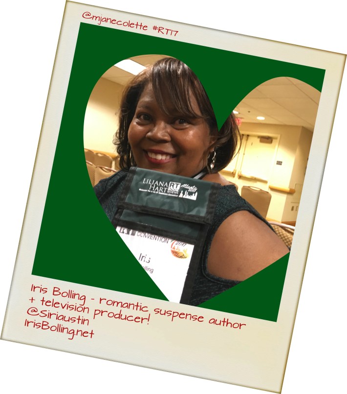 Iris Bolling, I met in registration line yesterday and, somehow, she now feels like an old friend. She writes romantic suspense–and she’s also the queen of street teams. I am in awe.