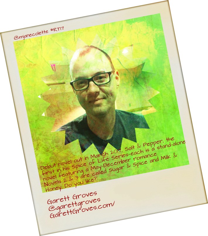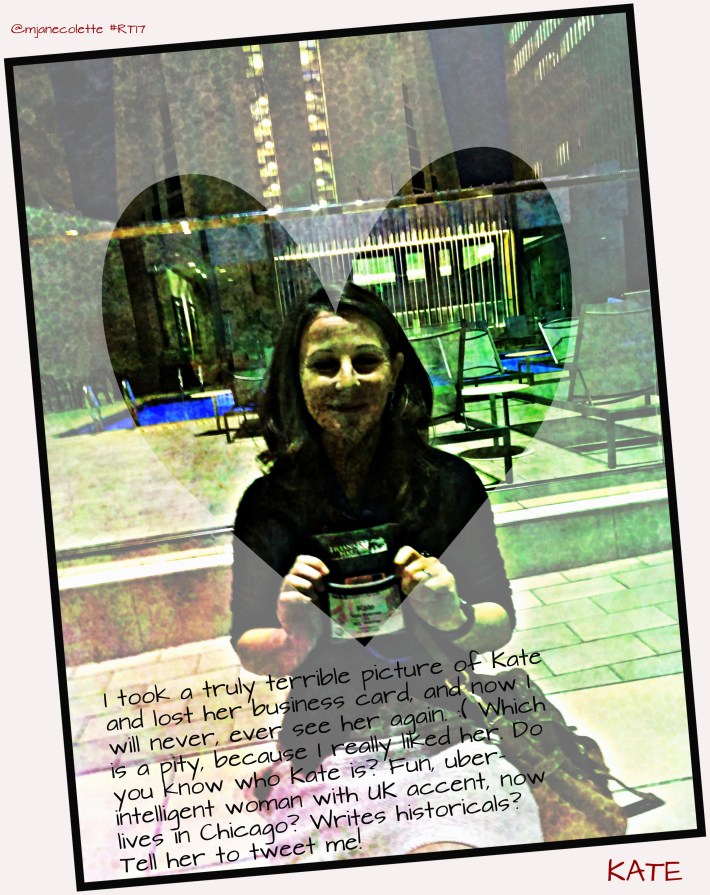 Misha Elliott—ok, this is funny… I sorta feel I know her, because I accidentally texted her as if she were an old friend. See, what happened is I have this Twitter friend Mischa Eliot, who is an erotica author. MisCha with a C and the single l and t writes fabulous smut and has a fabulous sexy blog, and is a really generous, sharing member of the Twittersphere (@mischa_eliot, you’re welcome). So when I saw Misha Elliott checking in on the RT17 App, I thought–ooh! Wow! How cool is that, I’ll finally get to meet MisCha face to face! And I sent Misha a message along the lines of “Squee! I just saw you check in! I’m here too! Let’s go grab a drink!” and then, just to make the situation doubly-weird, I tweeted to Mischa to tell her I messaged her on the RT App, and… well, it turned out Mischa wasn’t Misha, and Mischa was not coming to RT17 while Misha was, and I didn’t know Misha at all, except, well, now I did, because when you act like a total goof in front of a stranger and they’re lovely about it, that’s sort of the beginning of a friendship, right? Anyway–Misha (not MisCha) Elliott (not Eliot) is at RT, in this incredible panel on Book Clubs, and she is lovely. She writes romance… well, I’m just learning her books, but I’d say she writes across the genre and across genres–my favourite type of writer.