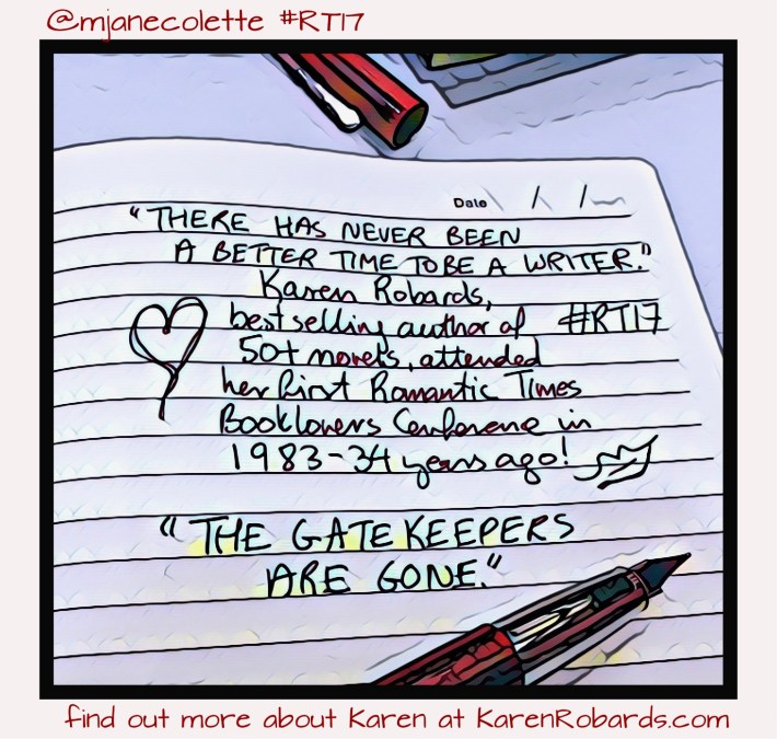 For me, it’s Karen Robards, veteran and best-selling author of more than 50 novels, who steals the show during her tribute to RT. Robards attended the very first RT Conference 34 years ago (“When I was nine years old, and already had three books published—I was very talented,” she quips). The industry has changed, is changing, yes, she says. But you know what?