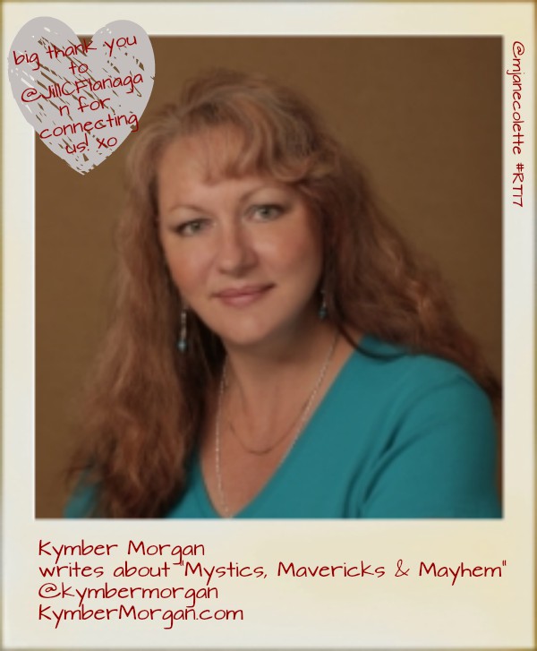 Kymber—author website KymberMorgan.com, go take a peek—writes paranormal, modern fantasy, and contemporary Western romance. When I go to pick her up from her room—she’s on floor four, I’m on floor 18, and the welcome breakfast is in the bowels of the Hyatt convention area, so she’s on the way—I pounce on her collection of books and her awesome poster, all ready for one of the big author signings she’s participating in.