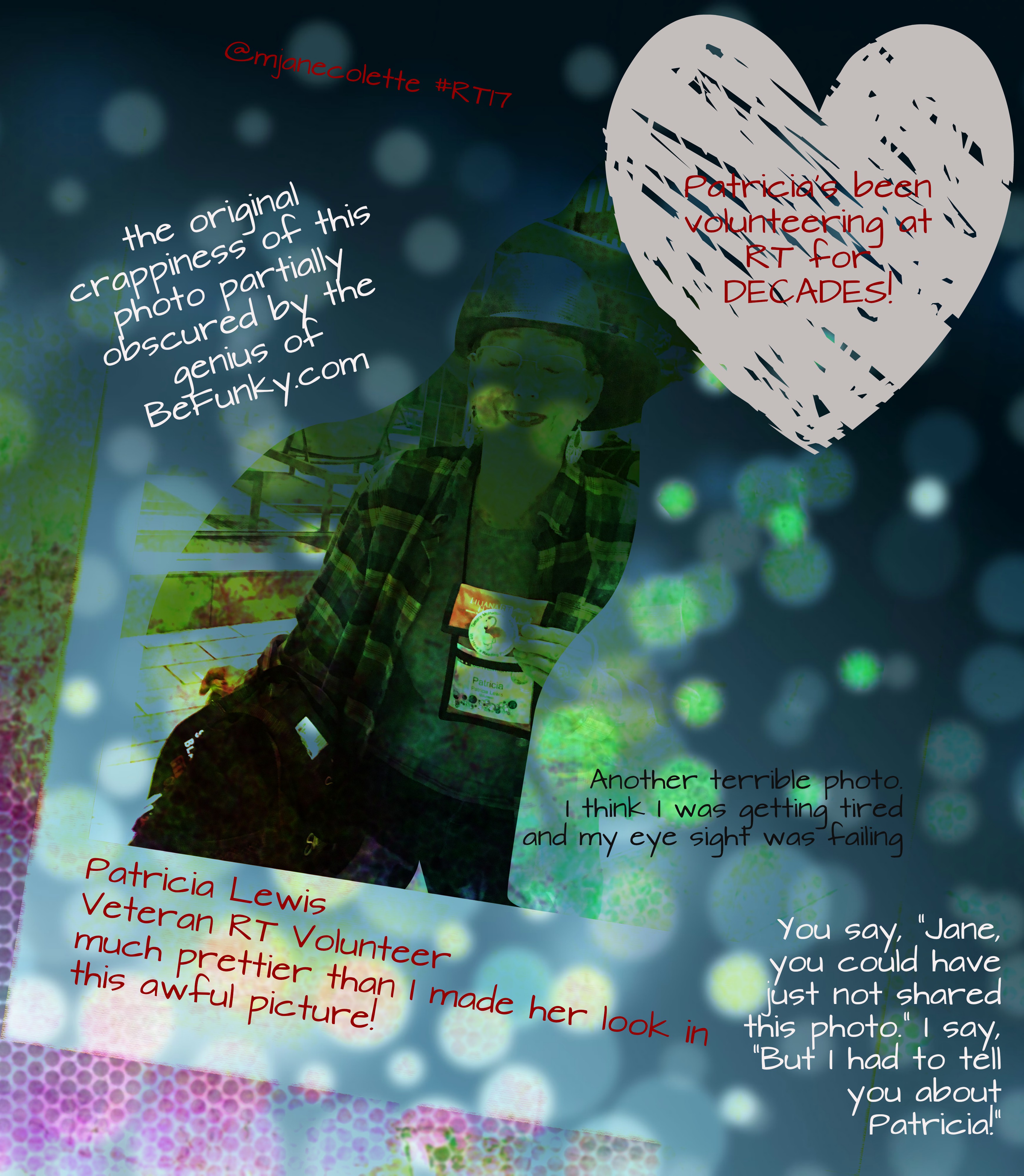 And Patricia Lewis is a hardcore RT volunteer who’s been doing the conference for 27 years. Which, incidentally, is one of the reasons I think Kathryn Falk must have magic around her. For so many among her staff, volunteers—and of course conference attendees!—to keep on coming back year after year after year… it’s not just about what she delivers, right? It’s about who she is.