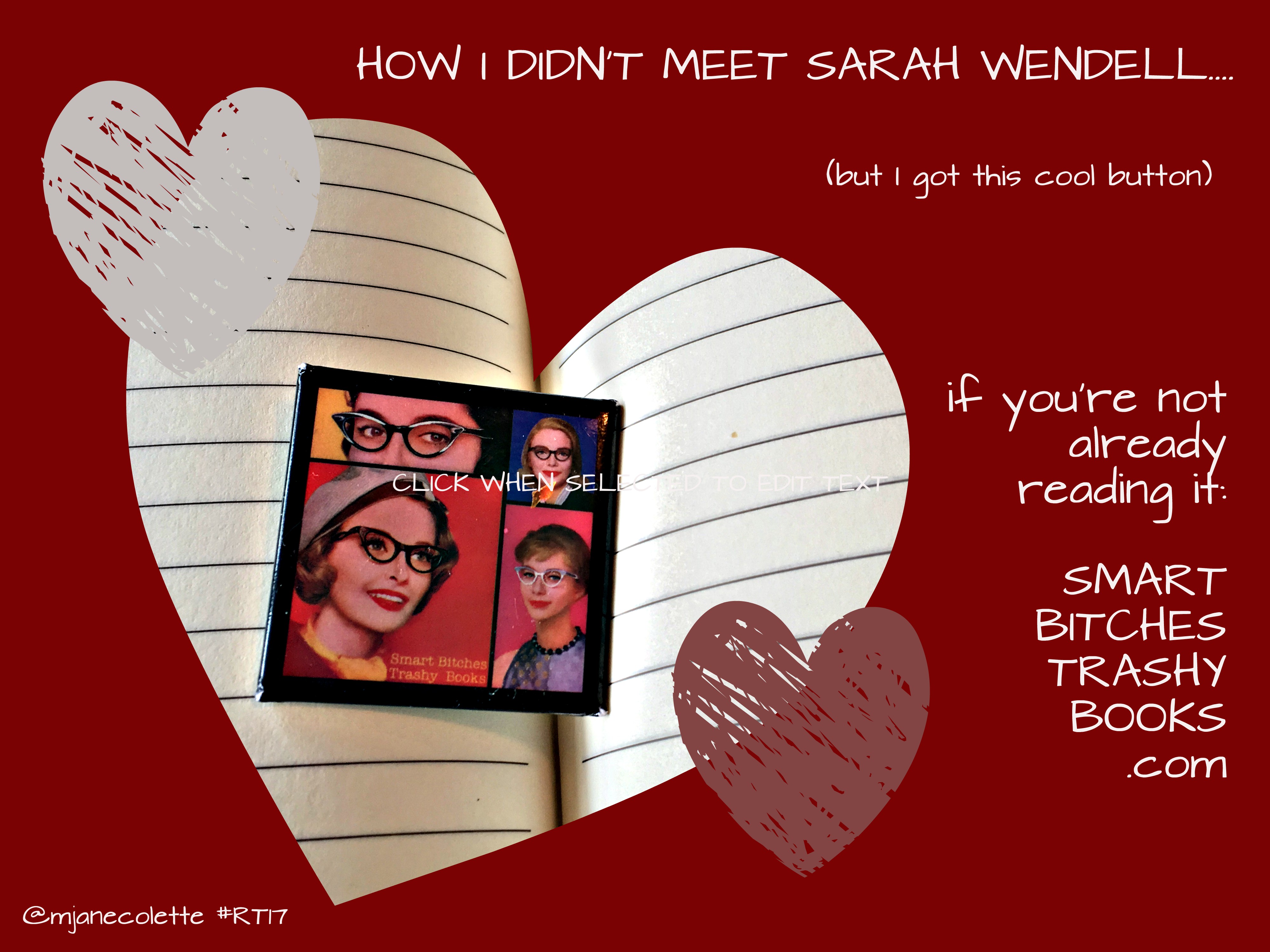But I hear that the Smart Bitches are hanging out in the hotel bar—Smart Bitches Trashy Books is, like, THE best romance book review blog on the planet, and I have a fan girl crush on Sarah Wendell, who dreamt up and runs the whole thing—and I need to see them, right?