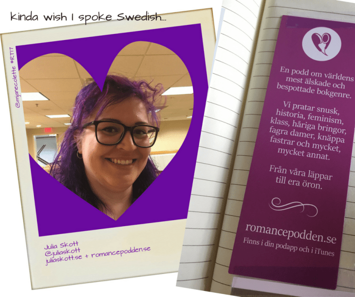 We run over the hour… and I stay behind to chat with Amy and Julia Skott, a romance blogger/podcaster from Sweden, who has this gloriously purple hair: