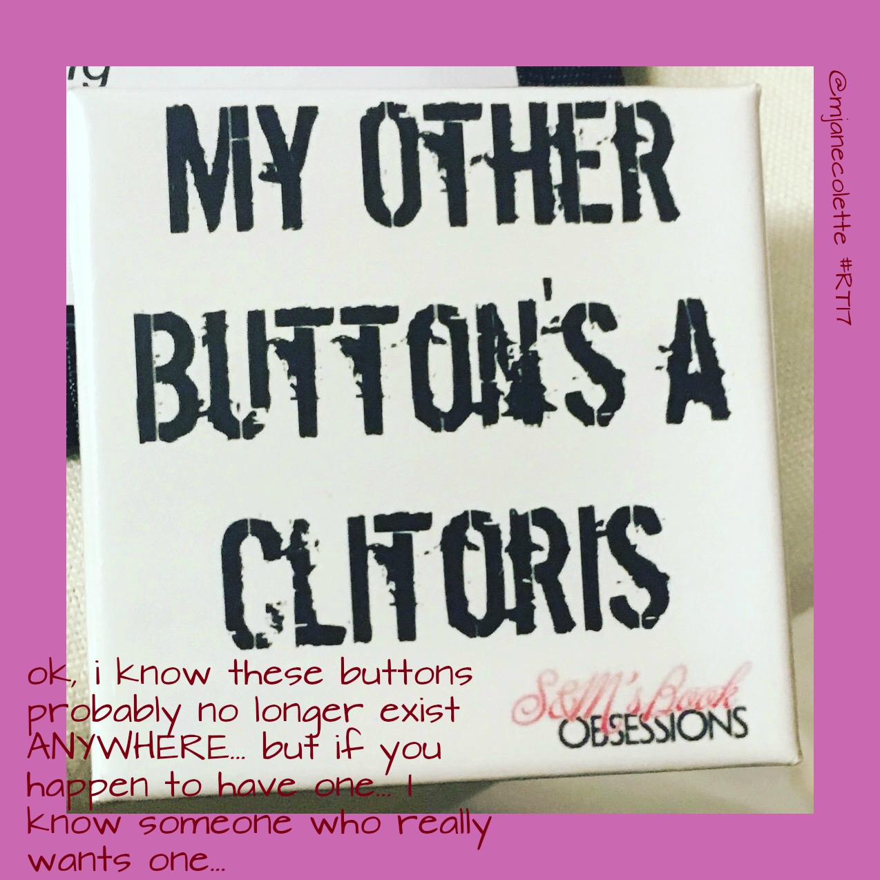 So instead of pitching, I end up in the Small Press Spotlight room. I say hi to Sarah Lyons’ arms again (the rest of her is there as well, representing Riptide) and take a picture of her awesome button: