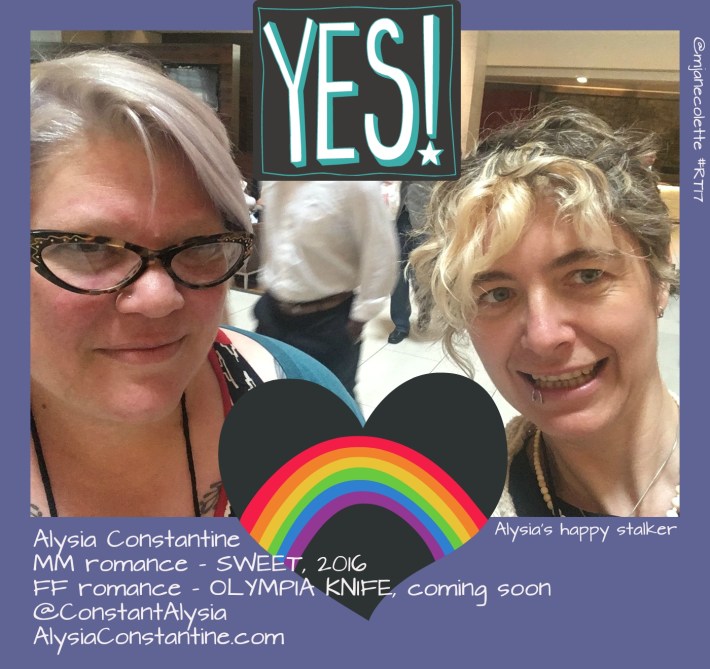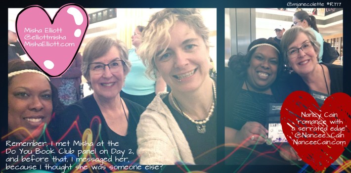 And then, I see Misha Elliott and I have to stop and tell her again how much I loved her panel, and Misha’s sitting next to Nancee Cain, so I meet her, and we take a goofy selfie: