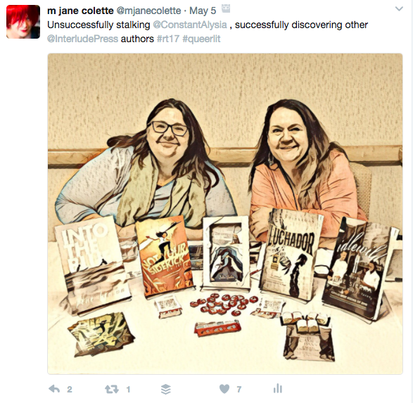 But I’m really there for Interlude Press… which publishes Alysia Constantine. Except she’s not there. I give my card to the editors, promise them I’m not a creepy stalker, but if they happen to be hanging with Alysia and she wouldn’t mind meeting me, I’d be so thrilled…