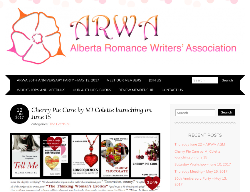 Let’s start with my friends at the Alberta Romance Writers Association, who gave me some nice ink pre-release day when life derailed me from being present and doing some of the stuff I needed to be doing: Cherry Pie Cure by MJ Colette launching on June 15 Thanks, Bret, Tammy et al. xoxo