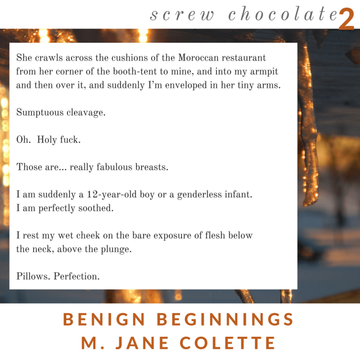 My story in Screw Chocolate 2 is called Benign Beginnings. It’s … different. I’m really anxious about the launch, and I’m not going to read it at the launch, because I want to make sure you get a chance to experience the other writers… so I decided to read it for you in my studio, to entice you to attend. K? Ready?
