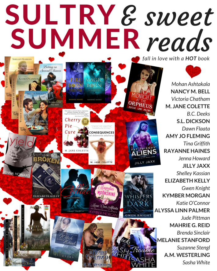Featured local authors include B.C. Deeks, Nancy M. Bell, Bernice Bohnet, Victoria Chatham, M. Jane Colette, Shaa Dickson, Amy Jo Fleming, Tina Griffith, Rayanne Haines, Jenna Howard, Jilly Jaxx, Shelley Kassian, Elizabeth Kelly, Gwen Knight, Kymber Morgan, Jan O’Hara, Katie O’Connor, Alyssa Linn Palmer, Jude Pittman, Mahrie G. Reid, Brenda Sinclair, Melanie Standford, Suzanne Stengl, Billie Turner, A. M. Westerling, and Sasha White.