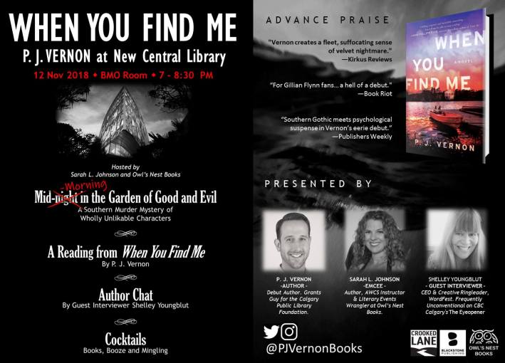 - P.J. Vernon, author of When You Find Me (Crooked Lane Books): Author Site + You also want to follow pjvernonbooks on Twitter & if you’re in Calgary, there’s this killer launch party happening on November 12: