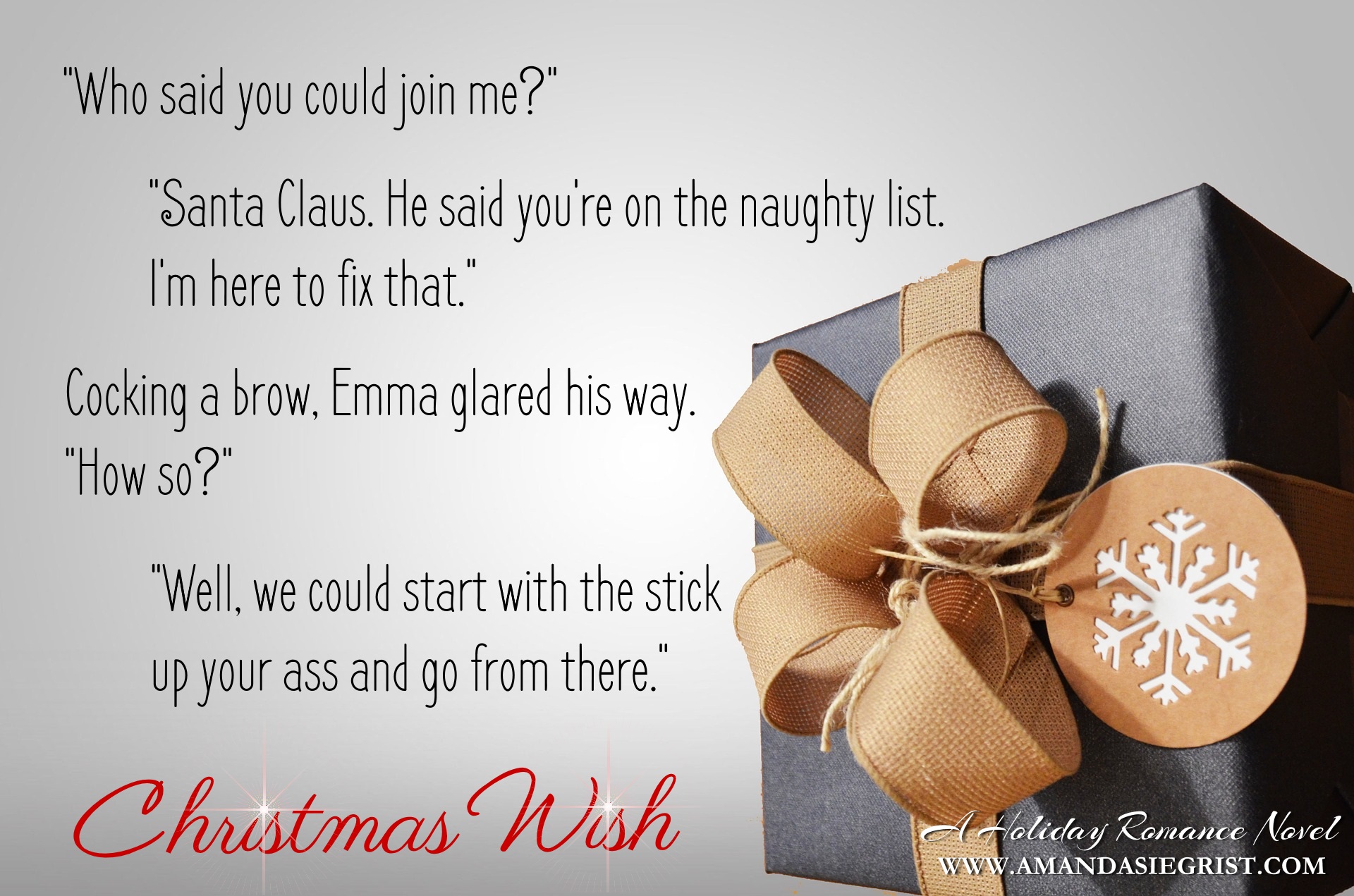 I have never met anyone who loves Christmas more than Amanda Siegrist, and so she was my first go-to author when I decided to shower you with love and lust during my least favourite time of the year. (Because, balance. Balance!) Amanda has an entire sexy Holiday Romance Series–of course she does–and she wants you to get a taste of Christmas Wish:
