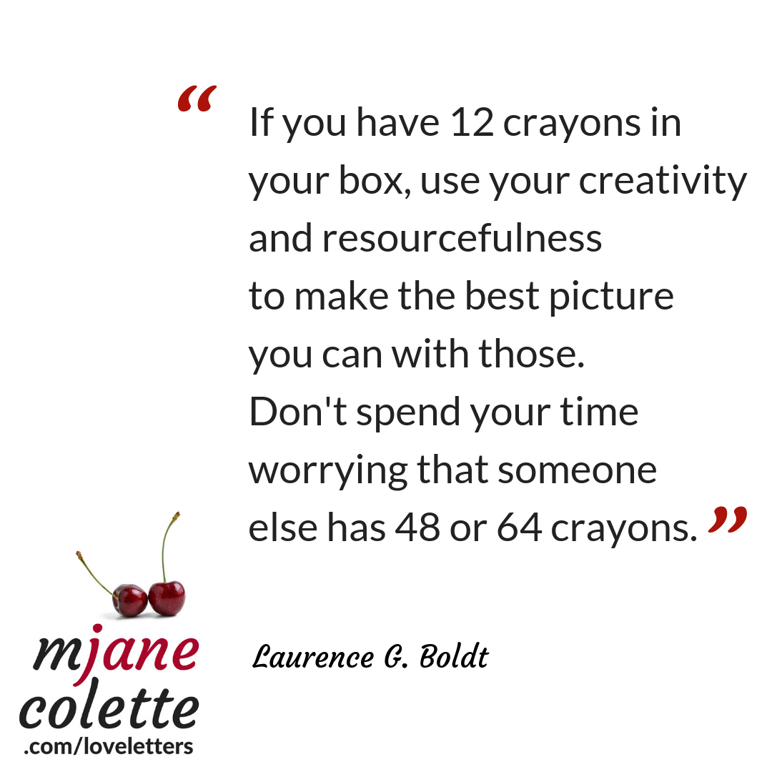 If you have 12 crayons in your box, use your creativity and resourcefulness to make the best picture you can with those. Don’t spend your time worrying that someone else has 48 or 64 crayons.