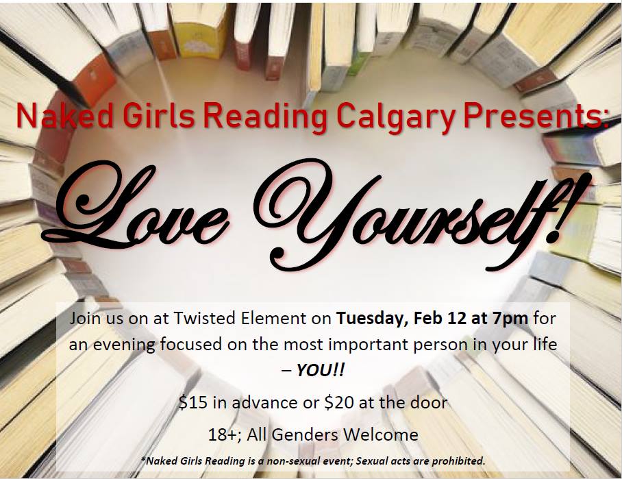 Otherwise, I am attending Unganisha in a purely spectative capacity on February 2–and you should do if you’re in yyc! And on February 8, I’m at the opening of the very talented artist Belinda Fireman’s show, This Is Me (Facebook event) at Loft 112. Then, on Tuesday, February 12–it’s another Naked Girls Reading!