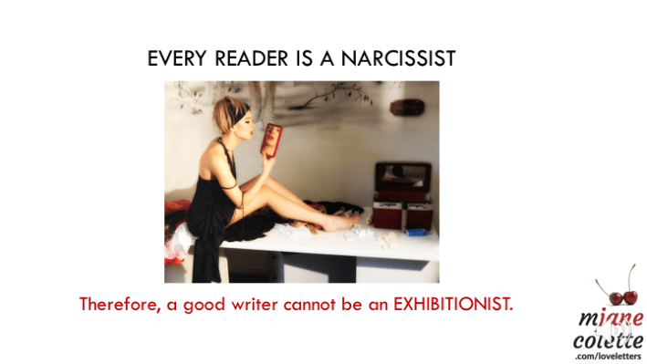Every reader is a narcissist. Therefore, a good writer cannot be an exhibitionist.