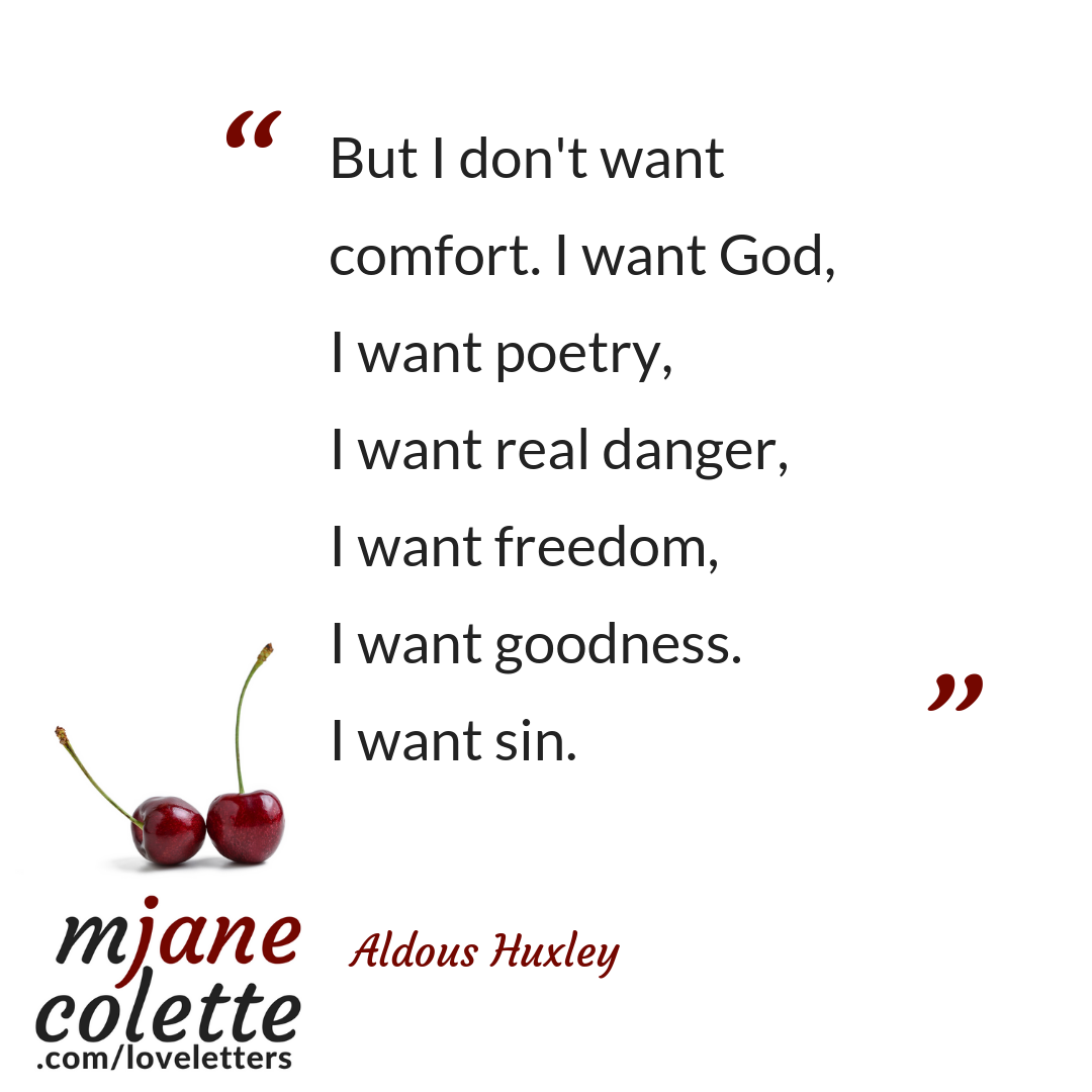 But I don’t want comfort. I want God, I want poetry, I want real danger, I want freedom, I want goodness. I want sin.