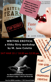 Happy Day After-International Women’s Day (may we soon not need it). If you’re in Calgary, come see me tomorrow (Sat. March 10) at the Alberta Romance Writers Association’s March meeting! I’m delivering two workshops that day. In the morning, we’re