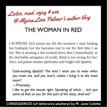 Welcome to Day 5 of the Consequences Audio Tour! If you’re in a hurry to listen to Chapter 5: THE WOMAN IN RED, run to ALYSSA LINN PALMER’s Author Blog RIGHT NOW! You: Hey, what’s with the password-protected post right