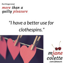 Today’s writing prompt: “I have a better use for clothespins.” You know what to do. GO. How & Why To Use Writing Prompts More Than A Guilty Pleasure Writing Prompts, Collected mjanecolette TellMe@mjanecolette.com WANT LOVE LETTERS? 💕 SIGN UP FOR LOVE