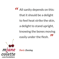 Happy Thanksgiving to my American friends. All sanity depends on this: that it should be a delight to feel heat strike the skin, a delight to stand upright, knowing the bones moving easily under the flesh. Doris Lessing Grateful to