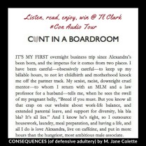 Welcome to Stop 14 of the Consequences Audio Tour! If you’re in a hurry to listen to Chapter 14: CUNT IN A BOARDROOM, hurry over to TL CLARK’s Author Blog RIGHT NOW! You: Hey, what’s with the password-protected post right beside