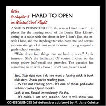 Welcome to Day 3 of the Consequences Audio Tour! If you’re in a hurry to listen to Chapter 3: HARD TO OPEN, run to WICKED COOL FLIGHT BLOG RIGHT NOW! You: Hey, what’s with the password-protected post right beside this