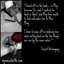 “Eased off on the book…in May because Dr. said I worked too hard in April, and May fine month to fish and make love to Miss Mary. I have to ease off on makeing love when writing hard as the