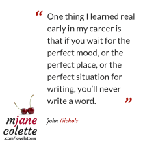 I wish I could explain to “aspiring authors” and “I love to write, but I just don’t have the time” writers how important this is: One thing I learned real early in my career is that if you wait for the perfect mood, or the perfect place, or the perfect situation for writing, you’ll never write a word. John Nichols mjanecolette TellMe@mjanecolette.com WANT LOVE LETTERS? 💕 SIGN UP FOR LOVE LETTERS & GET